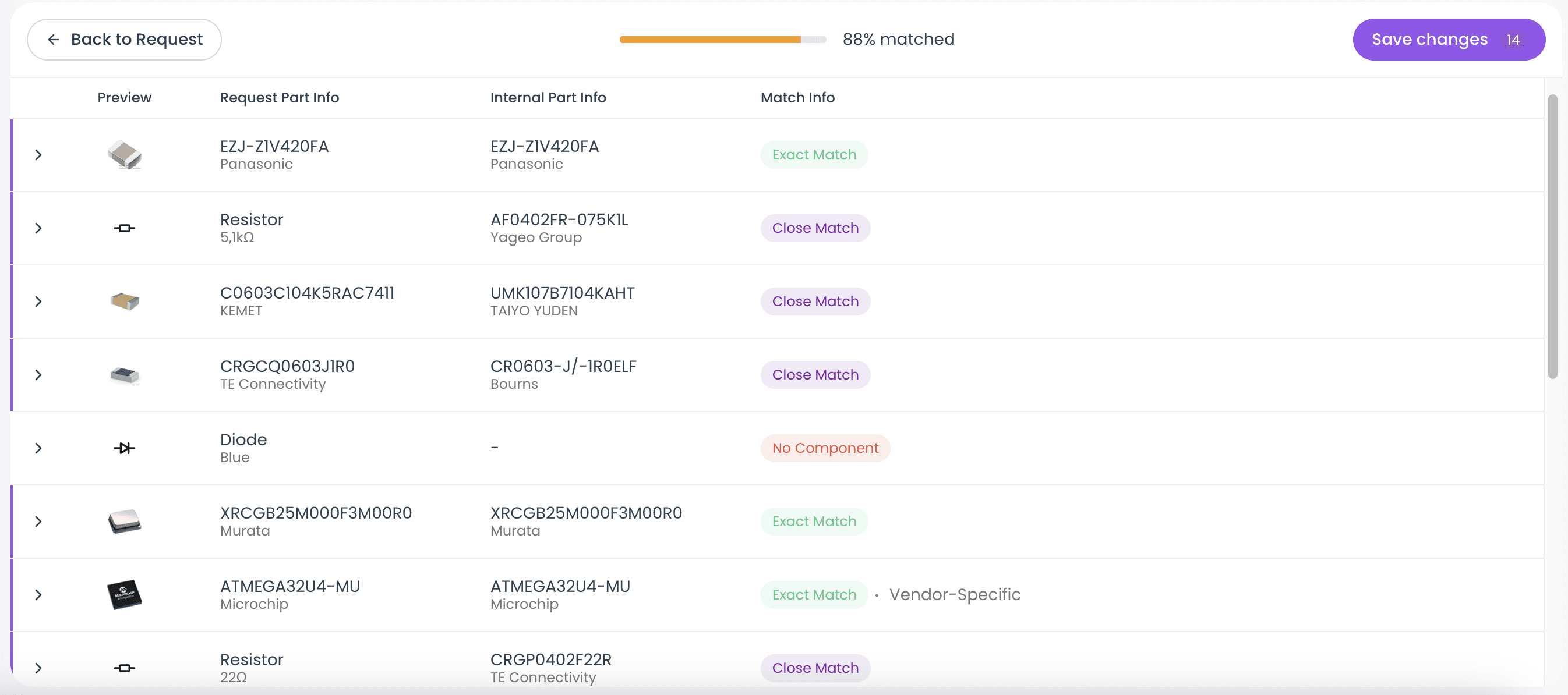 bee connect automatically matches each component (MPN) against your internally recorded part numbers (IPN)