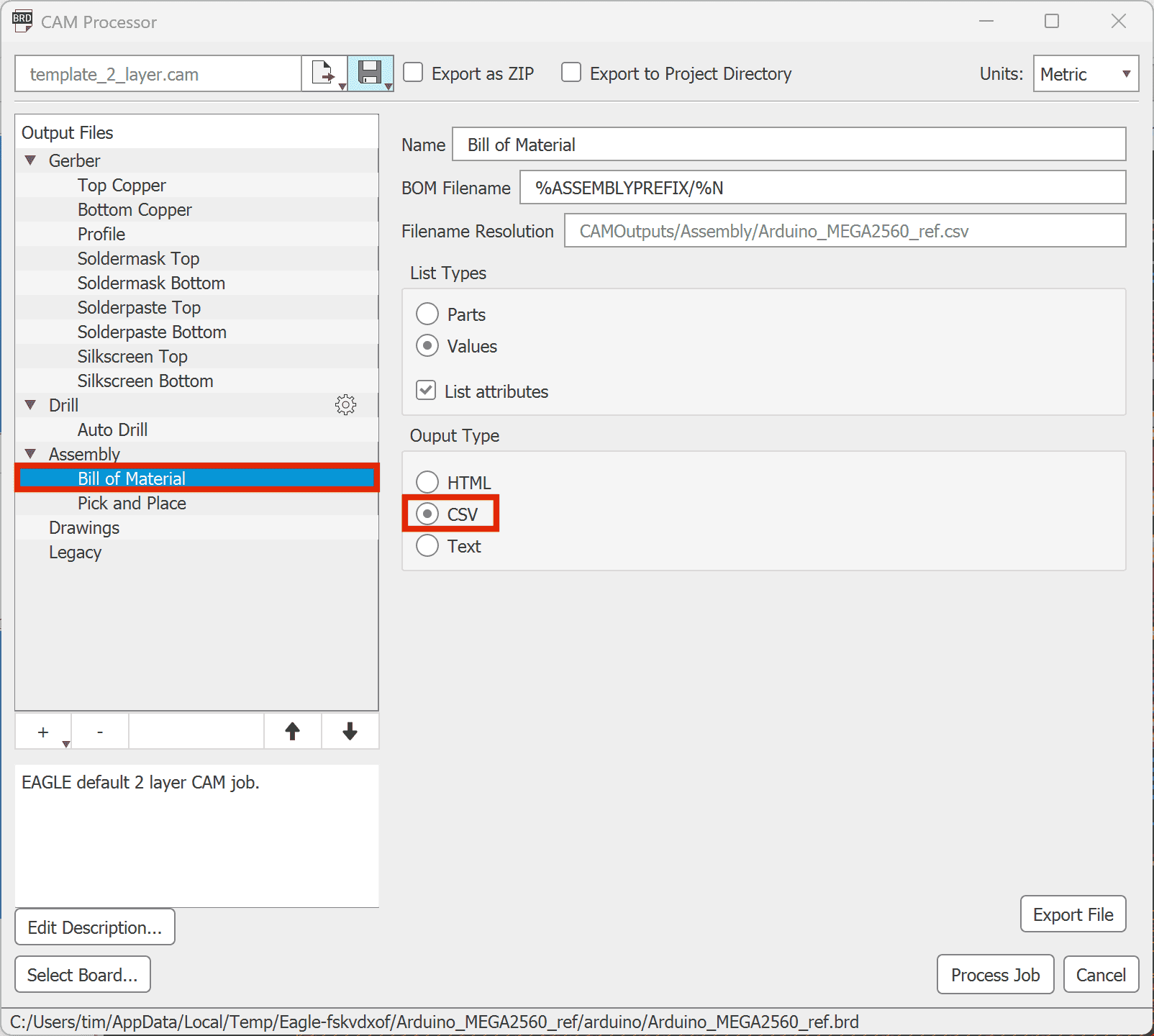 3. Seleziona “CSV” come Tipo di Output sotto “File di Output” -> “Assemblaggio” -> “Distinta Materiale”.