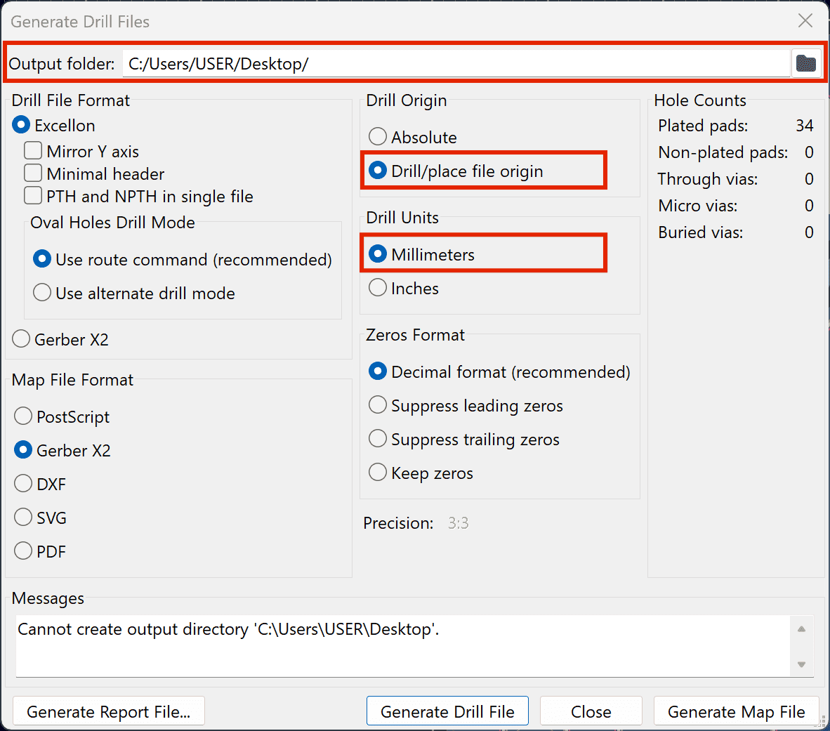 5. Select an output directory and click Generate Drill File.