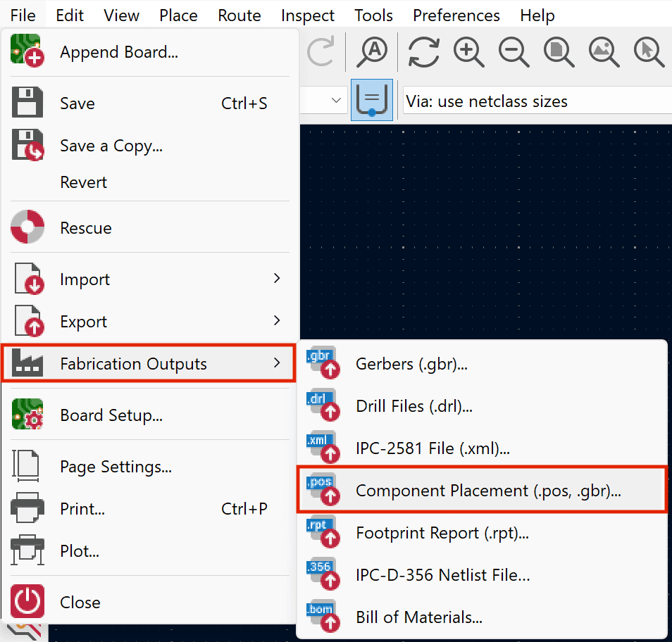 2. Click on File > Fabrication Outputs > Component Placement (.pos, .gbr).