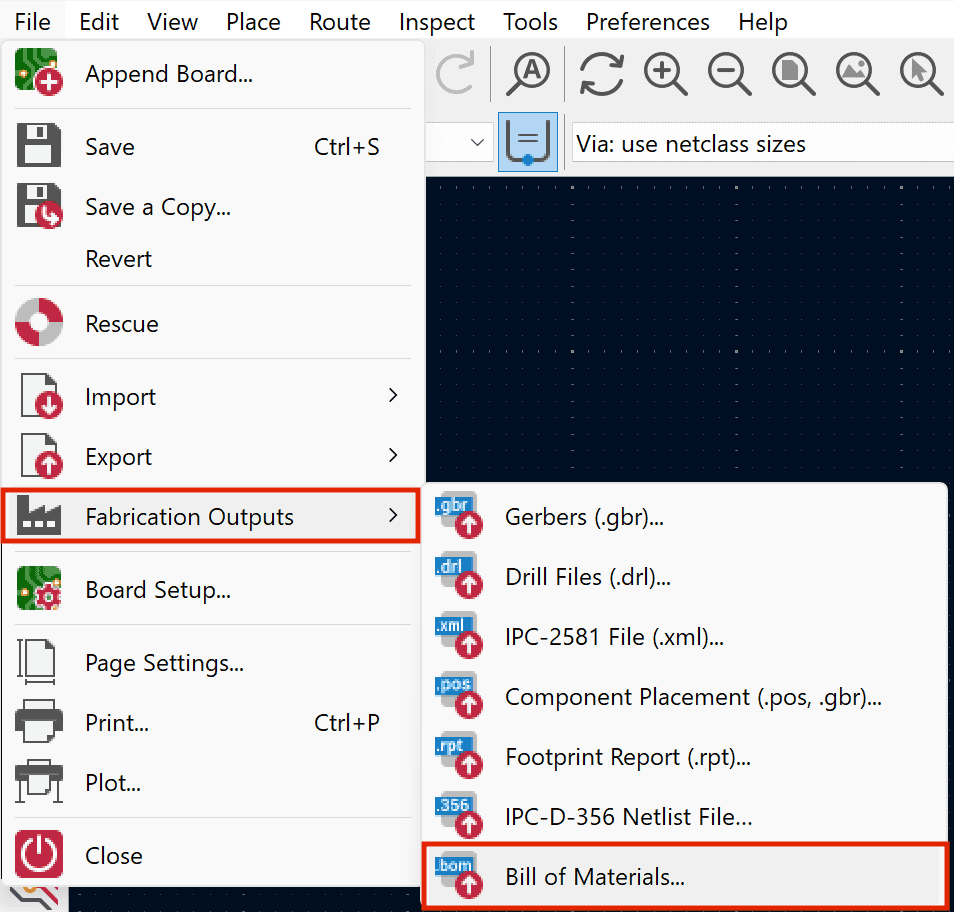 2. Click on File > Fabrication Outputs > Bill of Materials (BoM).