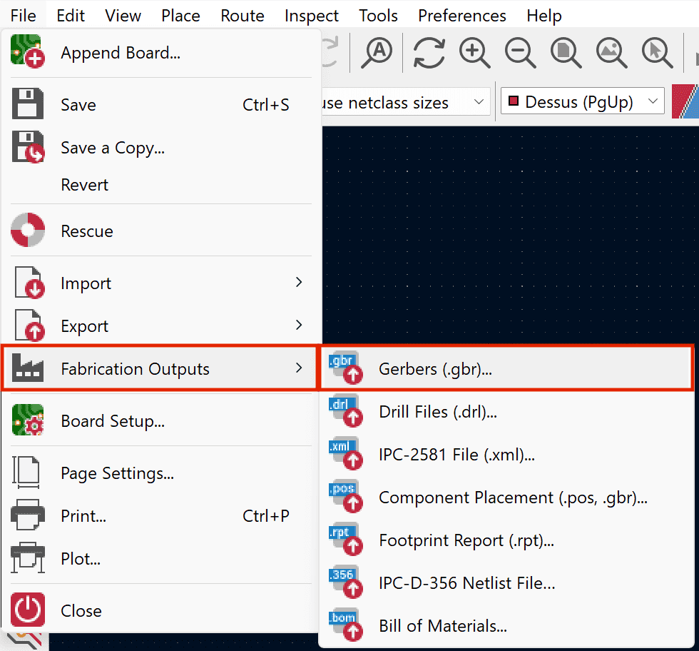 2. Click on File > Fabrication Outputs > Gerbers (.gbr).